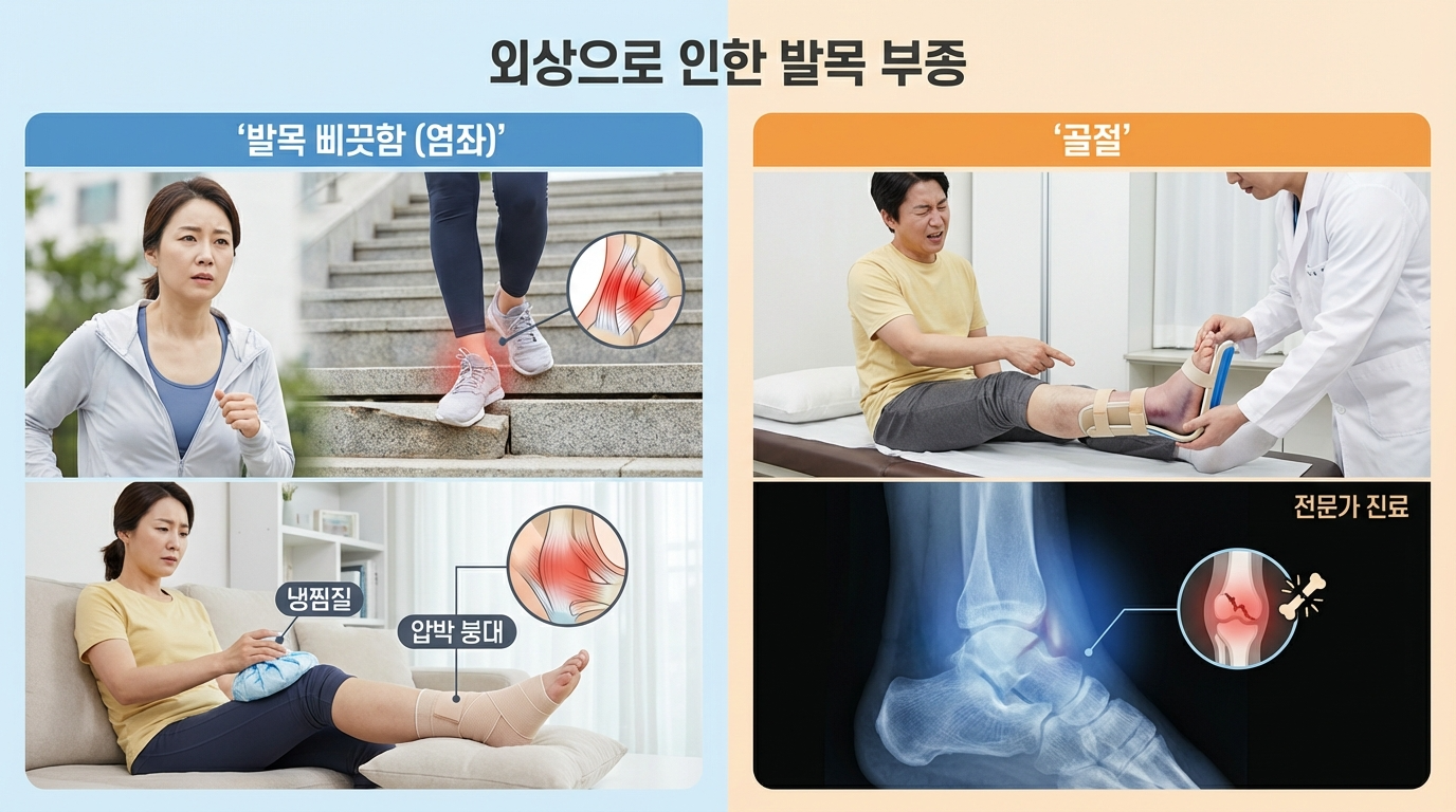 | 외상 | 발목 삐끗함, 골절 | 통증 심함, 급속 부종 | 냉찜질, 압박, 병원 |