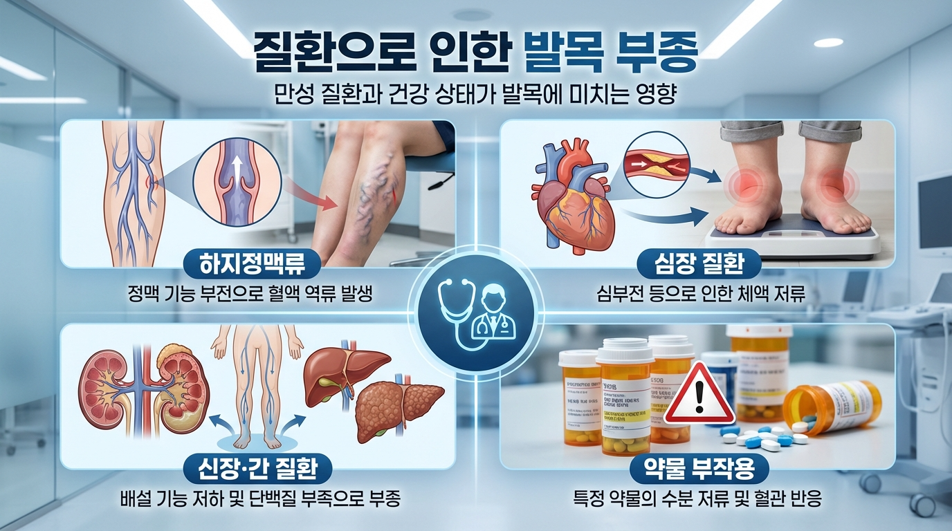| 질환 | 심장, 신장, 간 질환 | 다른 증상 동반 | 의료 진료 필수 |