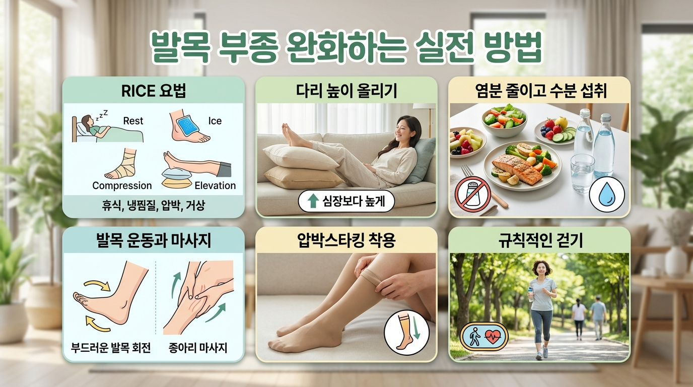 발목이 붓기 시작했을 때 가장 효과적인 방법은 RICE 요법이에요. R은 Rest(휴식), I는 Ice(냉찜질), C는 Compression(압박), E는 Elevation(거상)을 의미해요. 먼저 발목을 사용하지 않고 휴식해요. 그 다음 20~30분씩 냉찜질을 하고, 압박붕대로 살짝 감싼 후 발을 심장보다 높게 올려둬요. 이렇게 48시간 동안 집중적으로 관리하면 부기가 상당히 줄어들어요.